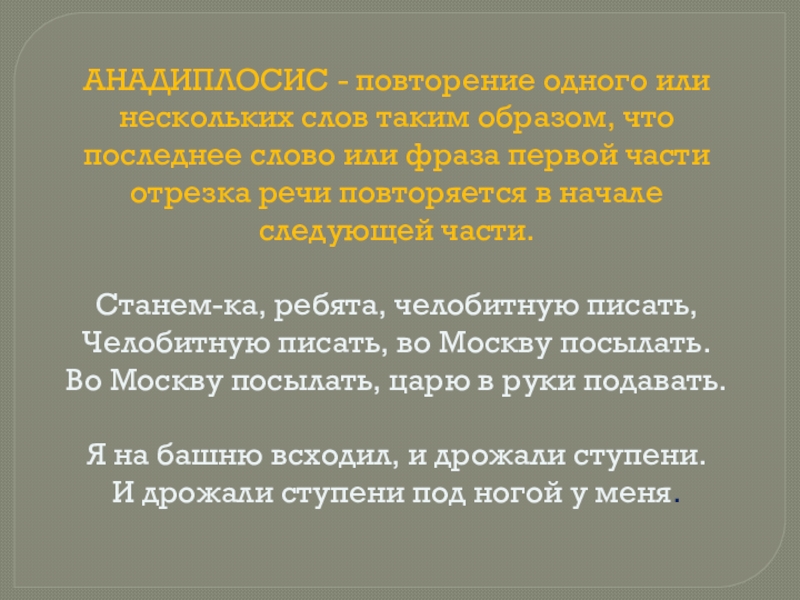 Слайд 12АНАДИПЛОСИС - повторение одного или нескольких слов таким образом, что последнее