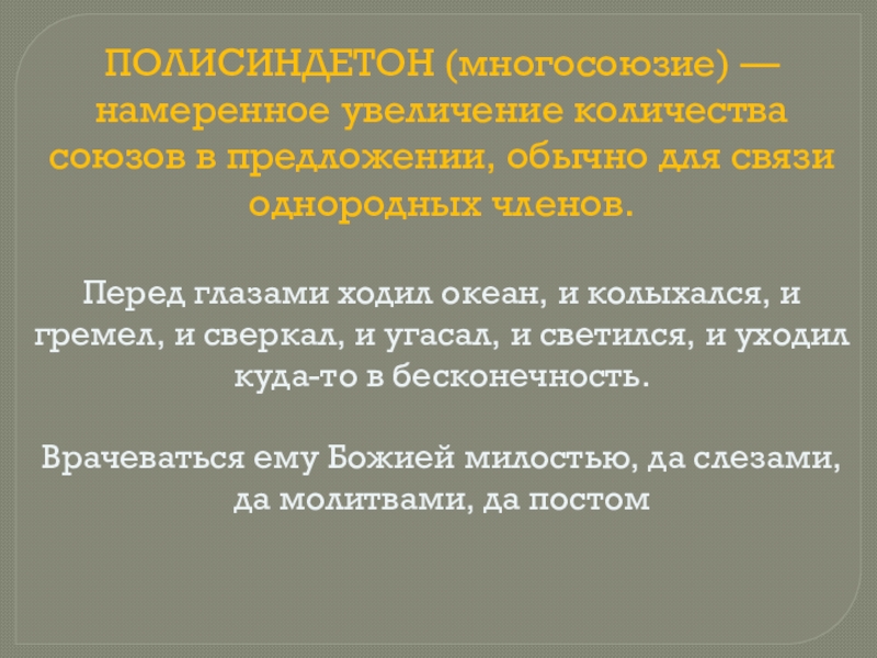 Слайд 9ПОЛИСИНДЕТОН (многосоюзие) — намеренное увеличение количества союзов в предложении, обычно для