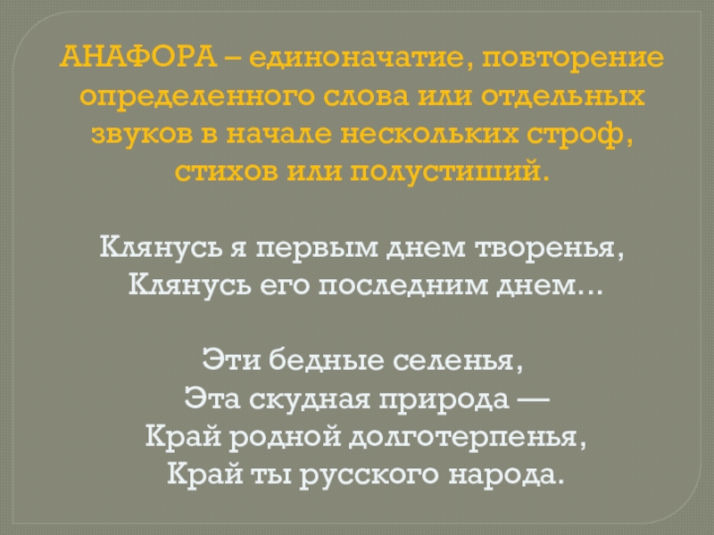 Слайд 4АНАФОРА – единоначатие, повторение определенного слова или отдельных звуков в начале