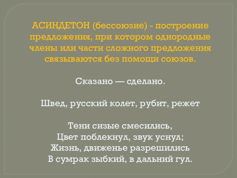 Слайд 8АСИНДЕТОН (бессоюзие) - построение предложения, при котором однородные члены или части