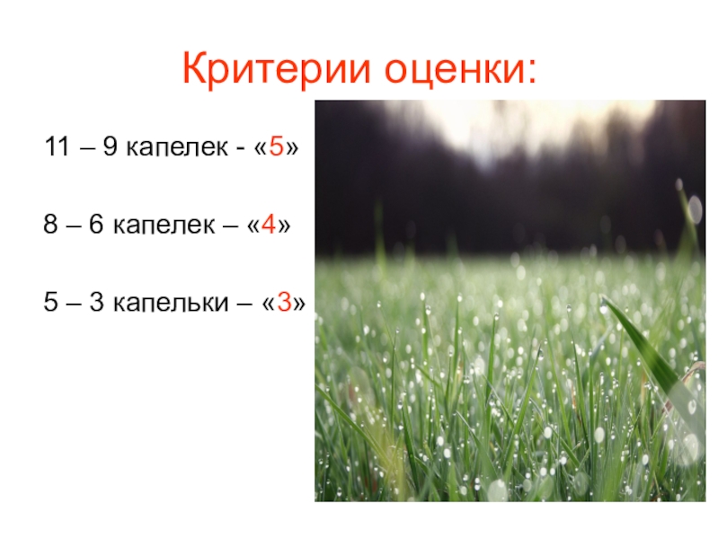 Критерии оценки:11 – 9 капелек - «5»8 – 6 капелек – «4»5 – 3 капельки – «3»