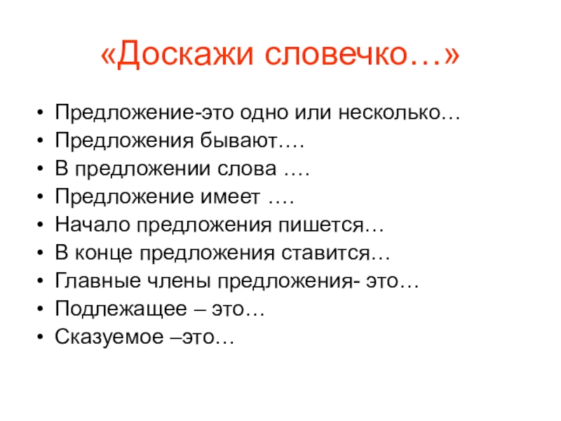 «Доскажи словечко…»Предложение-это одно или несколько…Предложения бывают….В предложении слова ….Предложение имеет ….Начало предложения пишется…В конце предложения ставится…Главные члены