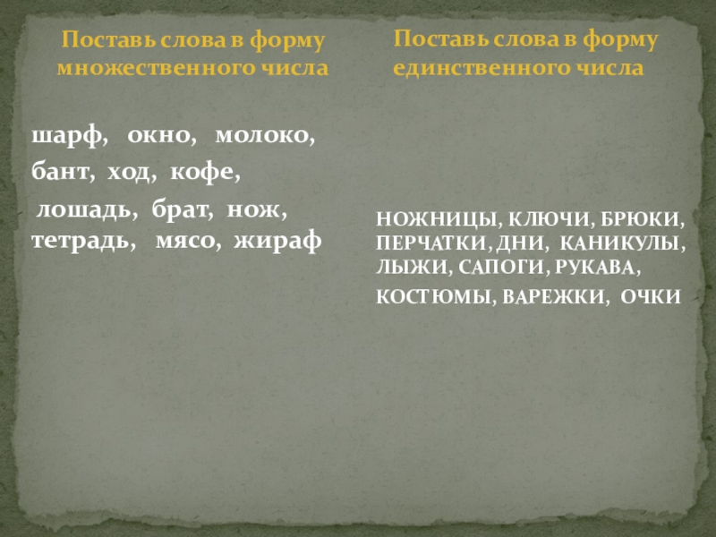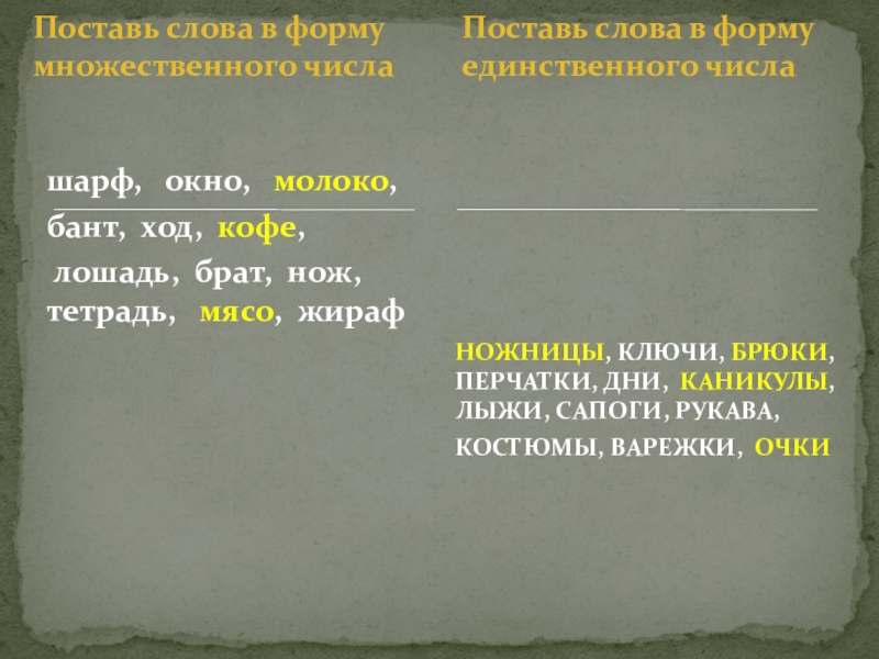 НОЖНИЦЫ, КЛЮЧИ, БРЮКИ, ПЕРЧАТКИ, ДНИ, КАНИКУЛЫ, ЛЫЖИ, САПОГИ, РУКАВА,