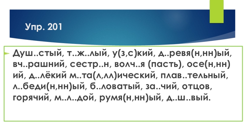 Душ..стый, т..ж..лый, у(з,с)кий, д..ревя(н,нн)ый, вч..рашний, сестр..н, волч..я (пасть), осе(н,нн)ий, д..лёкий