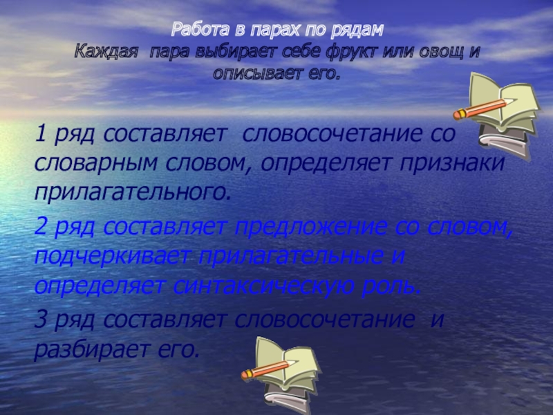 1 ряд составляет словосочетание со словарным словом, определяет признаки прилагательного.