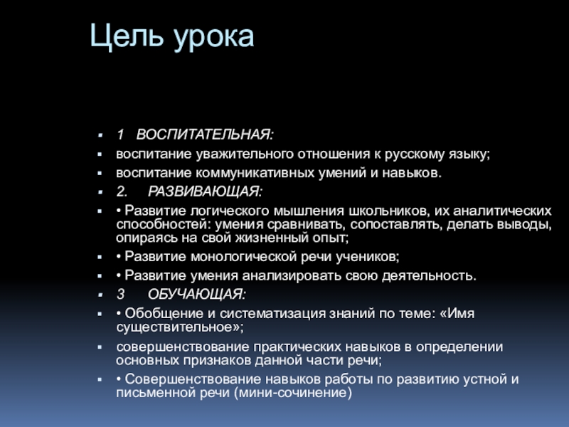 • Обобщение и систематизация знаний по теме: «Имя существительное»;