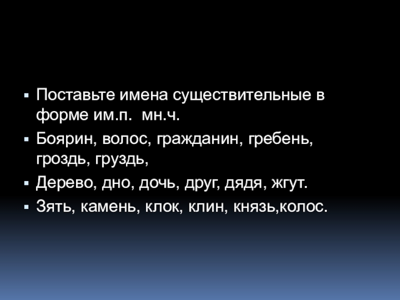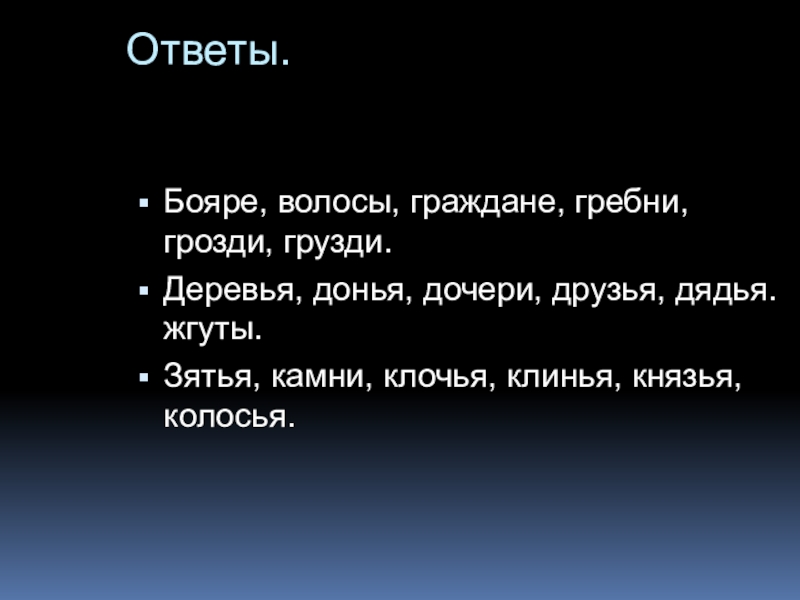 Бояре, волосы, граждане, гребни, грозди, грузди.