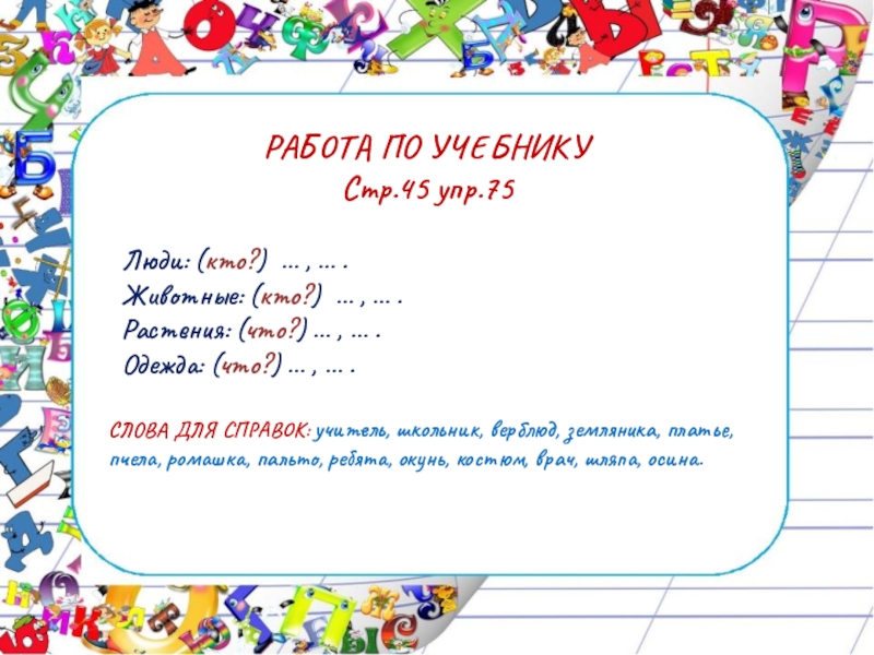 СЛОВА ДЛЯ СПРАВОК: учитель, школьник, верблюд, земляника, платье, пчела, ромашка, пальто, ребята, окунь, костюм, врач, шляпа, осина.