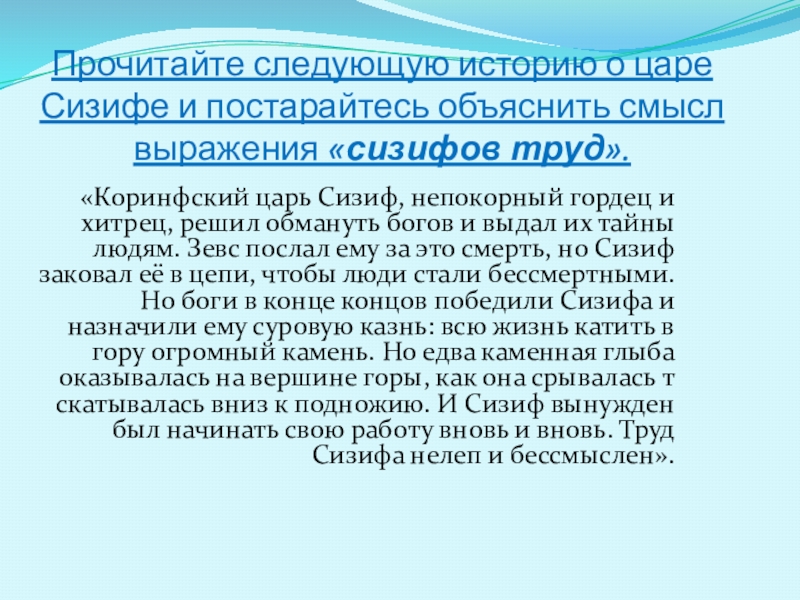 «Коринфский царь Сизиф, непокорный гордец и хитрец, решил обмануть богов и выдал их тайны людям. Зевс послал ему за это смерть, но Сизиф заковал её в цепи, чтобы люди стали бессмертными. Но боги в конце концов победили Сизифа и назначили ему суровую казнь: всю жизнь катить в гору огромный камень. Но едва каменная глыба оказывалась на вершине горы, как она срывалась т скатывалась вниз к подножию. И Сизиф вынужден был начинать свою работу вновь и вновь. Труд Сизифа нелеп и бессмыслен».