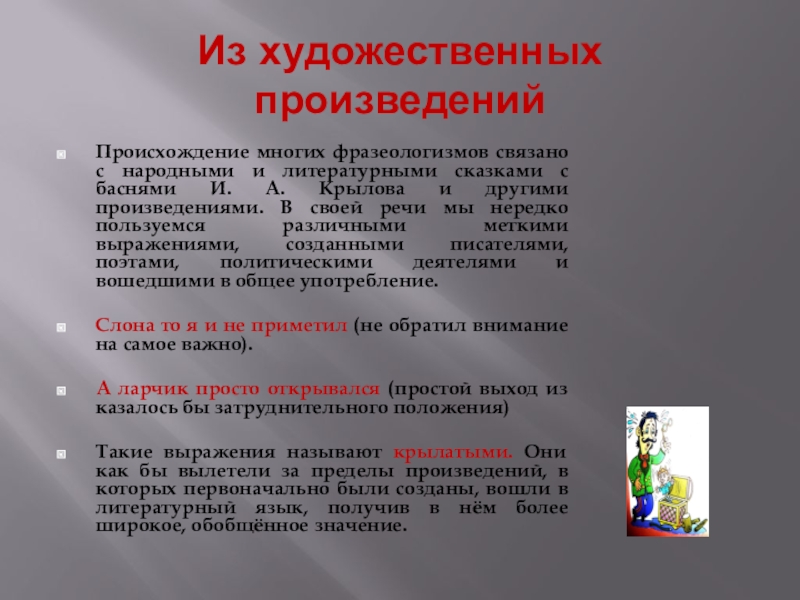 с баснями И. А. Крылова и другими произведениями. В своей речи мы нередко пользуемся различными меткими выражениями, созданными писателями, поэтами, политическими деятелями и вошедшими в общее употребление.