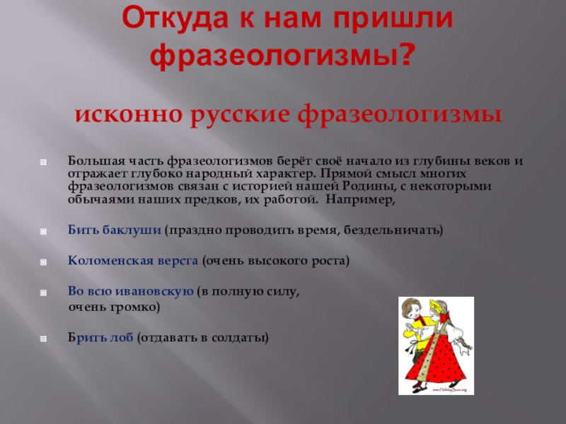 берёт своё начало из глубины веков и отражает глубоко народный характер. Прямой смысл многих фразеологизмов связан с историей нашей Родины, с некоторыми обычаями наших предков, их работой. Например,