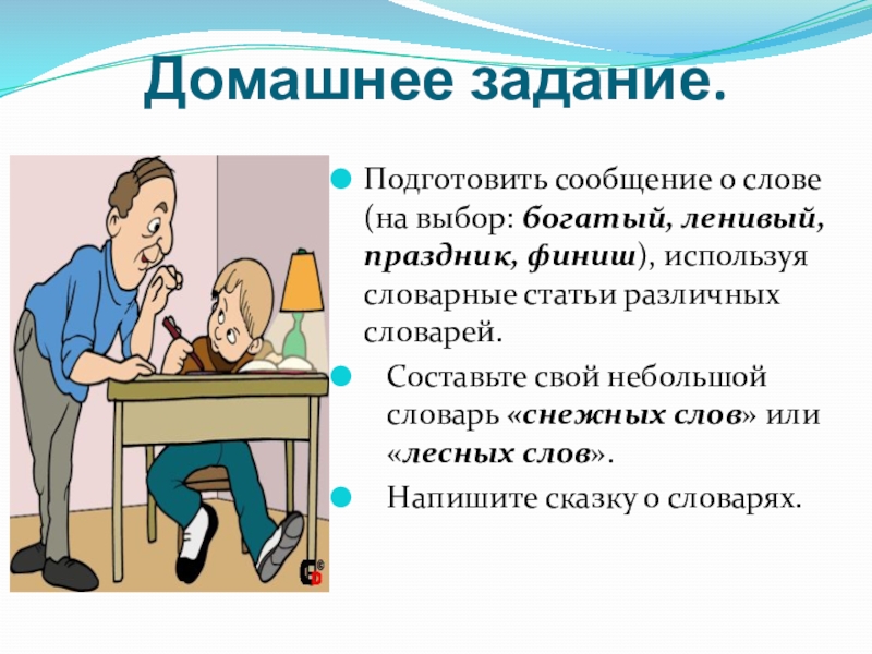 Подготовить сообщение о слове (на выбор: богатый, ленивый, праздник, финиш),
