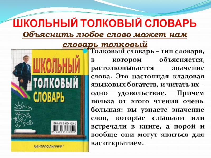 тип словаря, в котором объясняется, растолковывается значение слова. Это настоящая кладовая языковых богатств, и читать их – одно удовольствие. Причем польза от этого чтения очень большая: вы узнаете значение слов, которые слышали или встречали в книге, а порой и вообще они могут явиться для вас открытием.