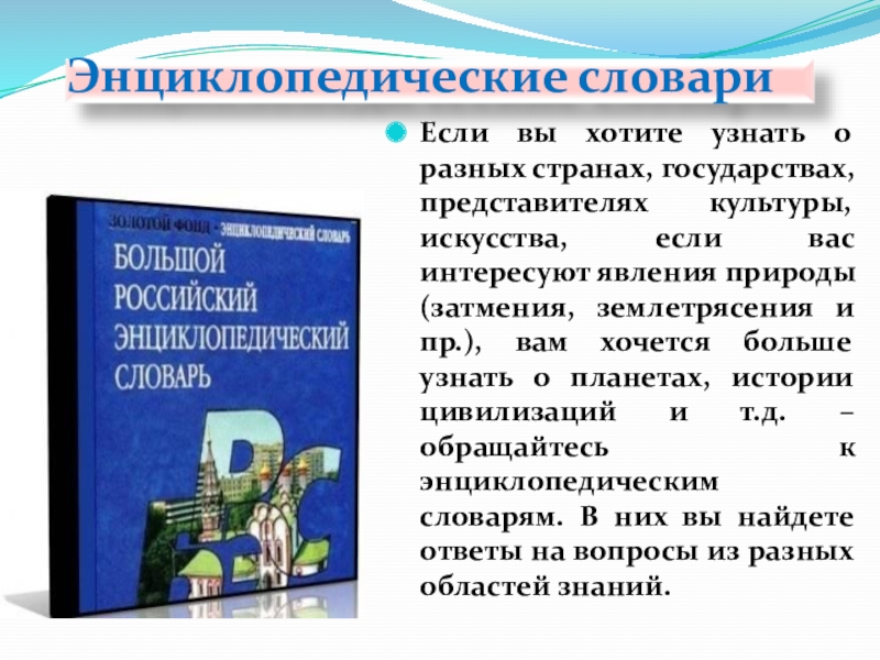 если вас интересуют явления природы (затмения, землетрясения и пр.), вам хочется больше узнать о планетах, истории цивилизаций и т.д. – обращайтесь к энциклопедическим словарям. В них вы найдете ответы на вопросы из разных областей знаний.