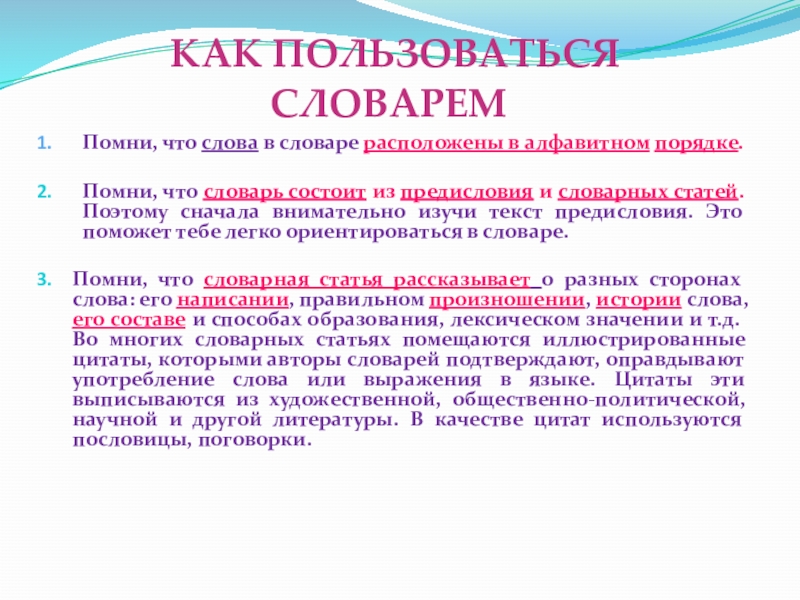 Помни, что словарная статья рассказывает о разных сторонах слова: его написании, правильном произношении, истории слова, его составе и способах образования, лексическом значении и т.д. Во многих словарных статьях помещаются иллюстрированные цитаты, которыми авторы словарей подтверждают, оправдывают употребление слова или выражения в языке. Цитаты эти выписываются из художественной, общественно-политической, научной и другой литературы. В качестве цитат используются пословицы, поговорки.