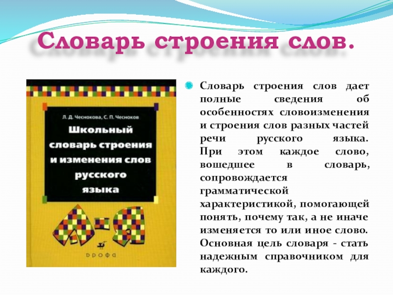 том, как образуются слова в русском языке. Слова в языке очень разнообразны по структуре. Слова, кроме корня, могут включать в себя и приставку, и суффикс, и окончание. Словарь показывает структуру слова, элементы, из которых оно состоит.