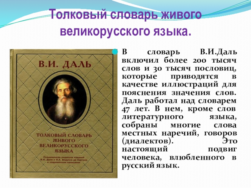 слов и 30 тысяч пословиц, которые приводятся в качестве иллюстраций для пояснения значения слов. Даль работал над словарем 47 лет. В нем, кроме слов литературного языка, собраны многие слова местных наречий, говоров (диалектов). Это настоящий подвиг человека, влюбленного в русский язык.