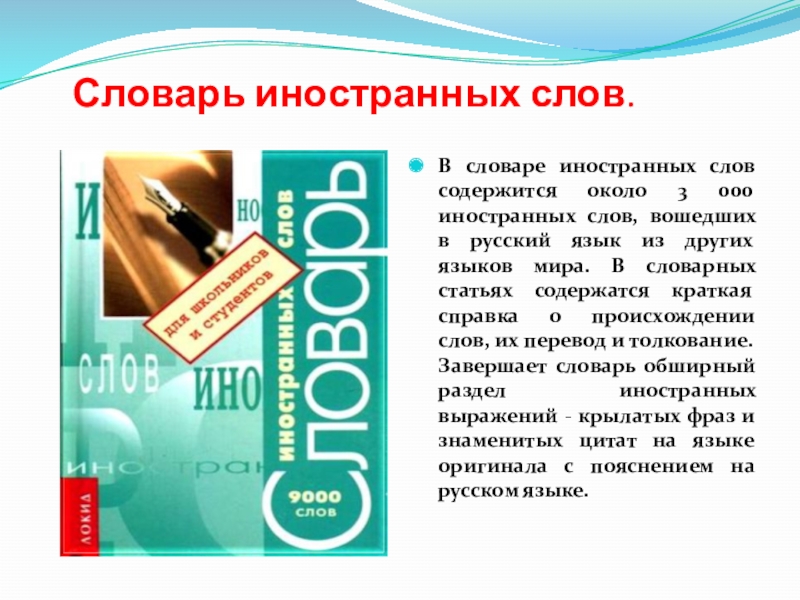 При чтении журналов, газет, книг вы часто встречаетесь со словами, вошедшими в русский язык из других языков мира. В моем словаре можно получить справку о значении незнакомого иностранного слова, сведения о его происхождении.