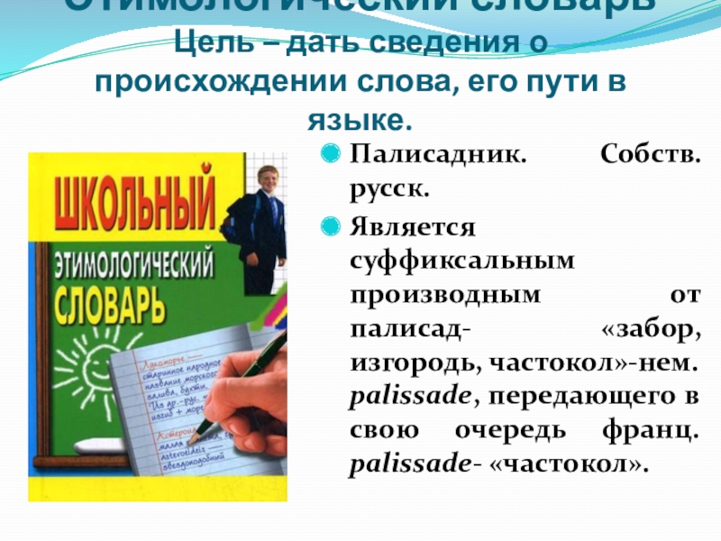 Является суффиксальным производным от палисад- «забор, изгородь, частокол»-нем. palissade, передающего в свою очередь франц. palissade- «частокол».