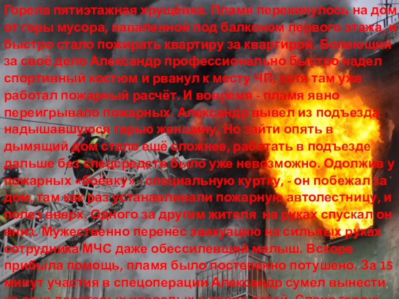под балконом первого этажа, и быстро стало пожирать квартиру за квартирой. Болеющий за своё дело Александр профессионально быстро надел спортивный костюм и рванул к месту ЧП, хотя там уже работал пожарный расчёт. И вовремя - пламя явно переигрывало пожарных. Александр вывел из подъезда надышавшуюся гарью женщину. Но зайти опять в дымящий дом стало ещё сложнее, работать в подъезде дальше без спецсредств было уже невозможно. Одолжив у пожарных «боёвку» - специальную куртку, - он побежал за дом, там как раз устанавливали пожарную автолестницу, и полез вверх. Одного за другим жителя на руках спускал он вниз. Мужественно перенёс эвакуацию на сильных руках сотрудника МЧС даже обессилевший малыш. Вскоре прибыла помощь, пламя было постепенно потушено. За 15 минут участия в спецоперации Александр сумел вынести из огня девятерых взрослых и троих детей. Слава герою-спасателю!