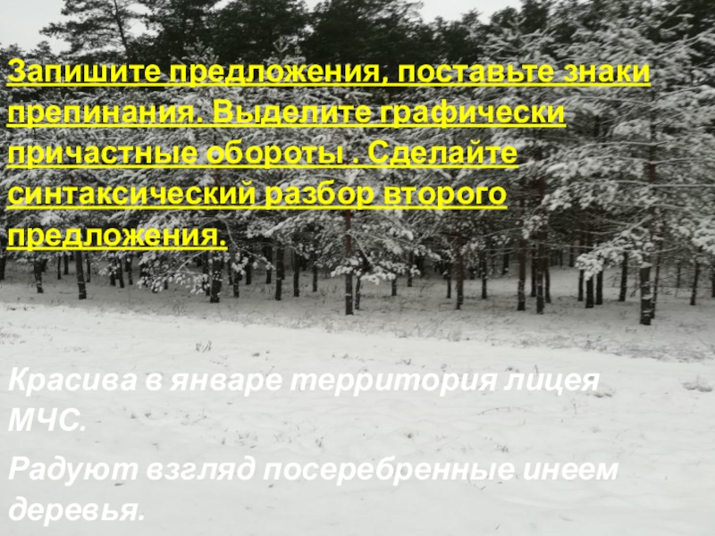 Слайд 4Запишите предложения, поставьте знаки препинания. Выделите графически причастные обороты . Сделайте