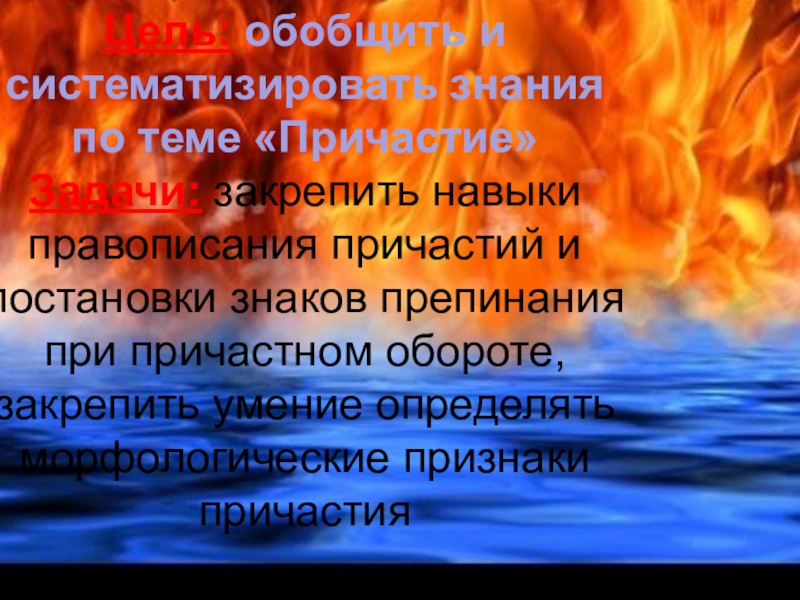 Цель: обобщить и систематизировать знания по теме «Причастие»Задачи: закрепить навыки правописания причастий и постановки знаков препинания при причастном обороте, закрепить умение определять морфологические признаки причастия