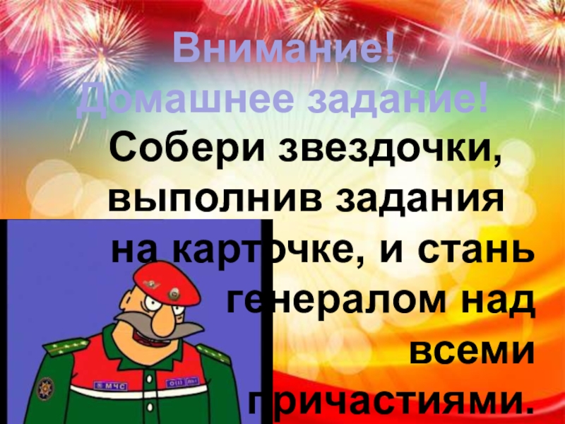 Внимание! Домашнее задание!Собери звездочки, выполнив заданияна карточке, и станьгенералом надвсеми причастиями.