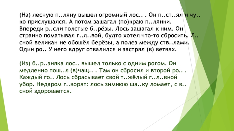 (На) лесную п..ляну вышел огромный лос.. . Он п..ст..ял и чу..ко прислушался. А потом зашагал (по)краю п..лянки.