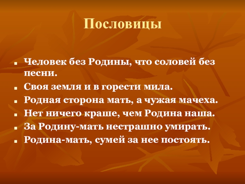 ПословицыЧеловек без Родины, что соловей без песни.Своя земля и в горести мила.Родная сторона мать, а чужая мачеха.Нет