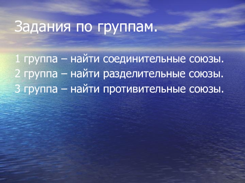 Задания по группам.1 группа – найти соединительные союзы.2 группа – найти разделительные союзы.3 группа – найти противительные
