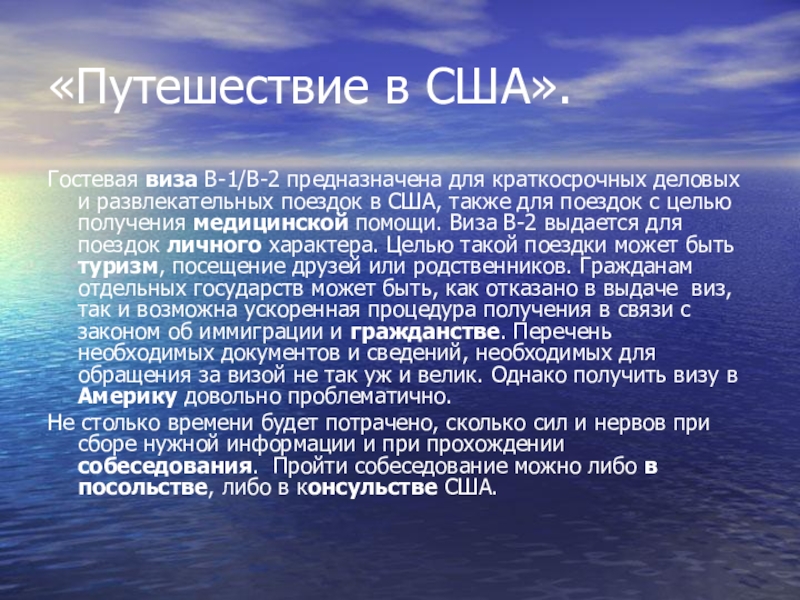 «Путешествие в США».Гостевая ……В-1/В-2 предназначена для краткосрочных деловых и развлекательных поездок в США, также для поездок с