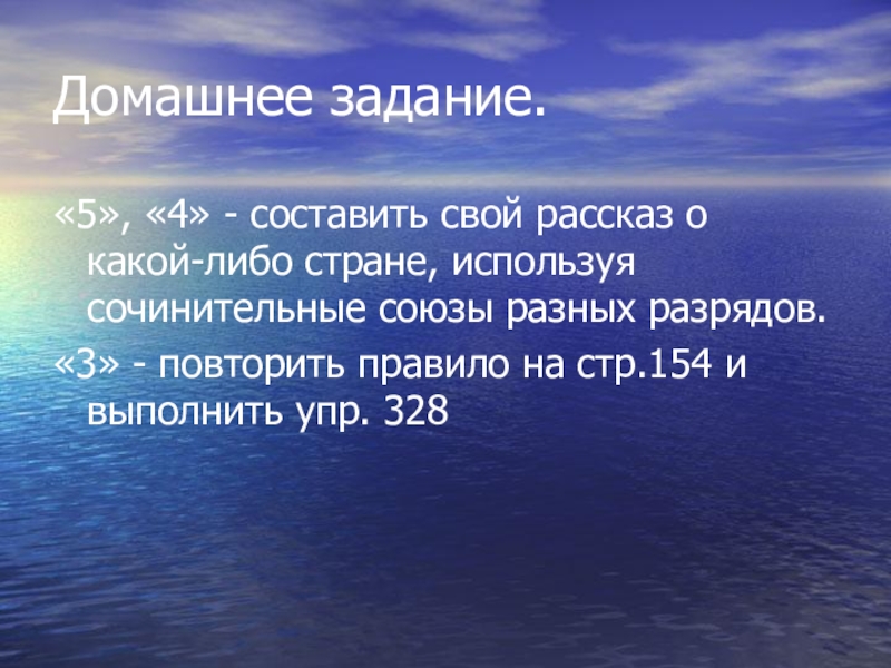 Домашнее задание.«5», «4» - составить свой рассказ о какой-либо стране, используя сочинительные союзы разных разрядов.«3» - повторить