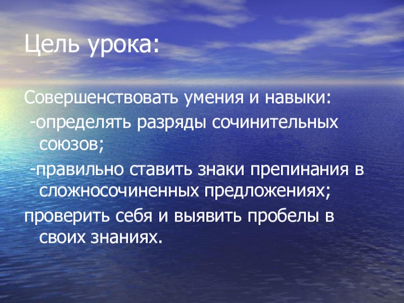 Цель урока:Совершенствовать умения и навыки: -определять разряды сочинительных союзов; -правильно ставить знаки препинания в сложносочиненных предложениях;проверить себя и выявить пробелы в своих знаниях.