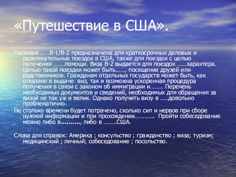 Слова для справок: Америка ; консульство ; гражданство ; виза; туризм; медицинский ; личный; собеседование ; посольство.