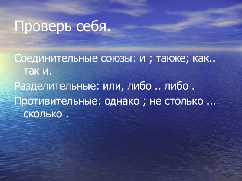 Проверь себя.Соединительные союзы: и ; также; как..так и.Разделительные: или, либо .. либо .Противительные: однако ; не столько