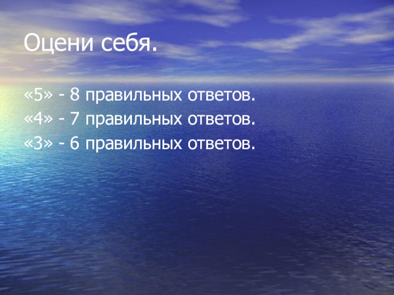 Оцени себя.«5» - 8 правильных ответов.«4» - 7 правильных ответов.«3» - 6 правильных ответов.