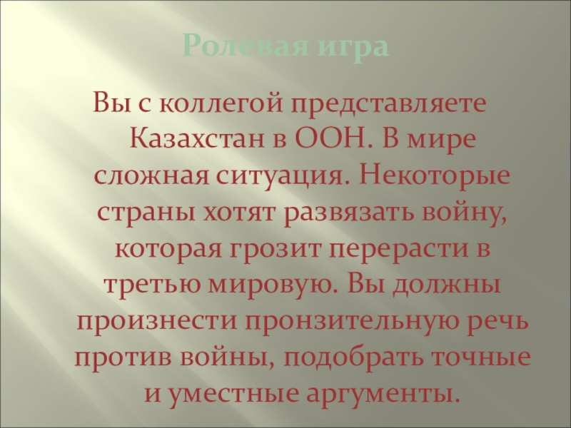 Ролевая играВы с коллегой представляете Казахстан в ООН. В мире сложная ситуация. Некоторые страны хотят развязать войну,