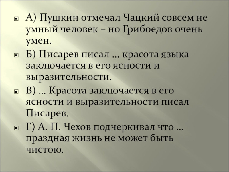 А) Пушкин отмечал Чацкий совсем не умный человек – но Грибоедов очень умен.Б) Писарев писал … красота