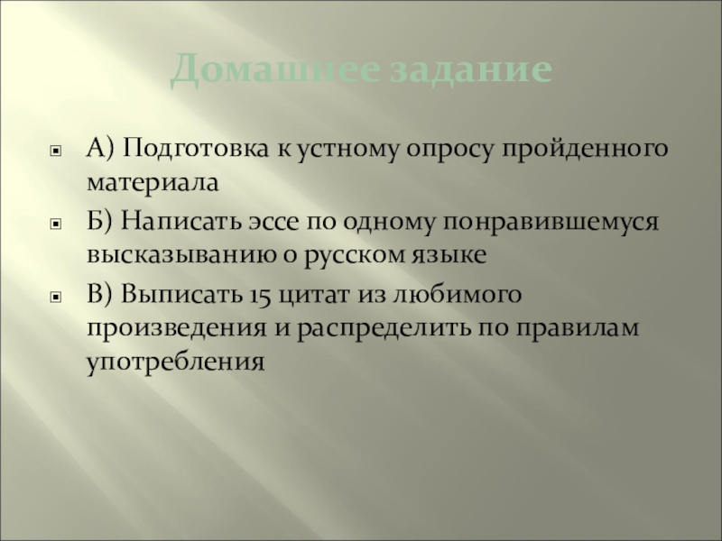 Домашнее заданиеА) Подготовка к устному опросу пройденного материалаБ) Написать эссе по одному понравившемуся высказыванию о русском языкеВ)