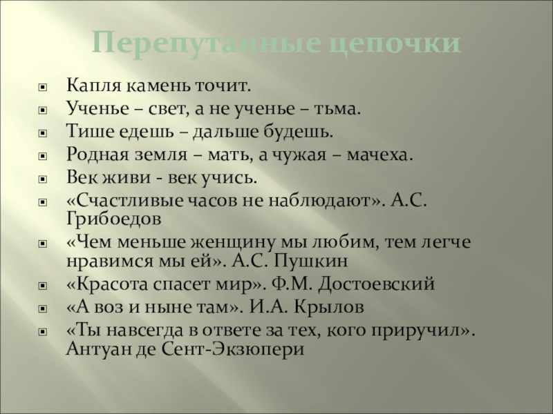 Перепутанные цепочкиКапля камень точит.Ученье – свет, а не ученье – тьма.Тише едешь – дальше будешь.Родная земля –
