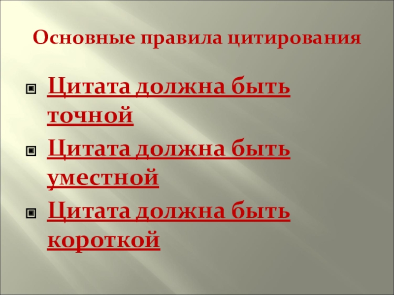 Основные правила цитированияЦитата должна быть точнойЦитата должна быть уместнойЦитата должна быть короткой