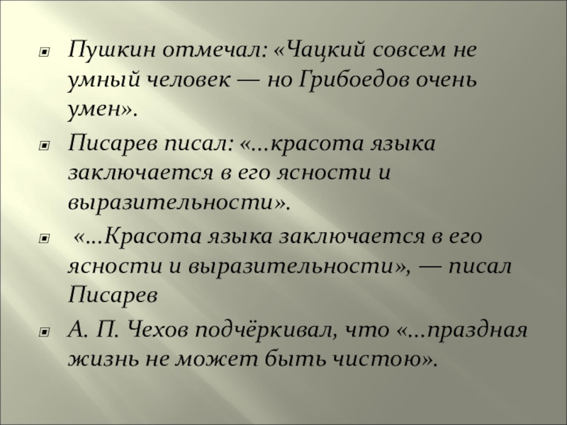 Пушкин отмечал: «Чацкий совсем не умный человек — но Грибоедов очень умен».Писарев писал: «...красота языка заключается в