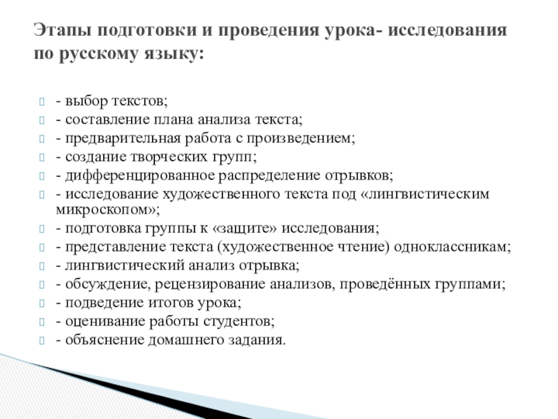 Этапы подготовки и проведения урока- исследования по русскому языку: