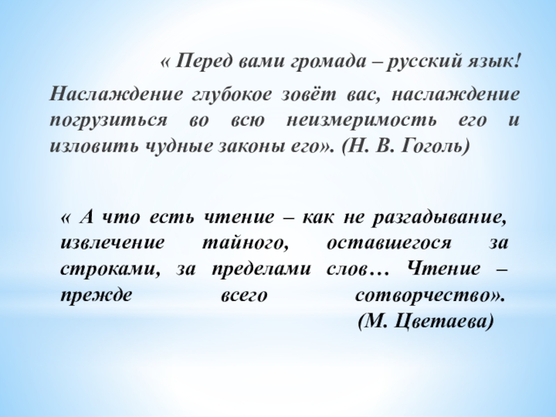 Наслаждение глубокое зовёт вас, наслаждение погрузиться во всю неизмеримость его и изловить чудные законы его». (Н. В. Гоголь)