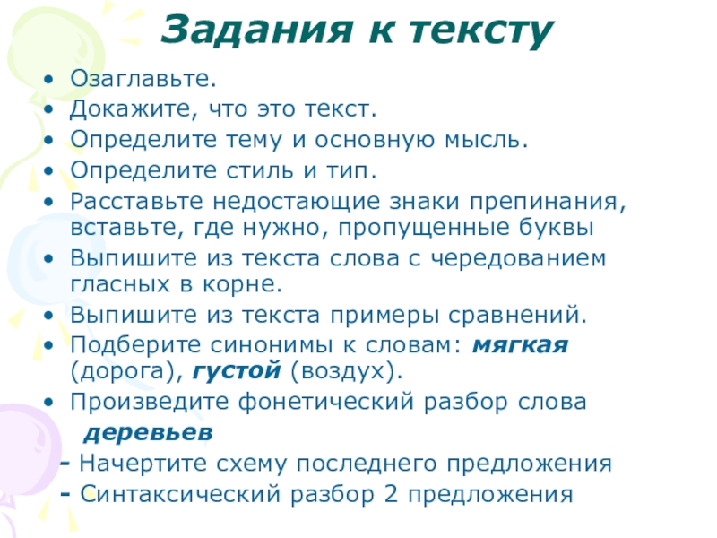 Задания к текстуОзаглавьте.Докажите, что это текст.Определите тему и основную мысль.Определите стиль и тип.Расставьте недостающие знаки препинания, вставьте,