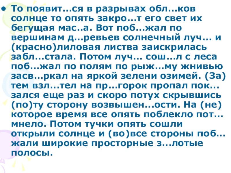 их бегущая мас..а. Вот поб...жал по вершинам д...ревьев солнечный луч... и (красно)лиловая листва заискрилась забл...стала. Потом луч... сош...л с леса поб...жал по полям по рыж...му жнивью засв...ркал на яркой зелени озимей. (За)тем взл...тел на пр...горок пропал пок...зался еще раз и скоро потух скрывшись (по)ту сторону возвышен...ости. На (не)которое время все опять поблекло пот...мнело. Потом тучки опять сошли открыли солнце и (во)все стороны поб...жали широкие просторные з...лотые полосы.