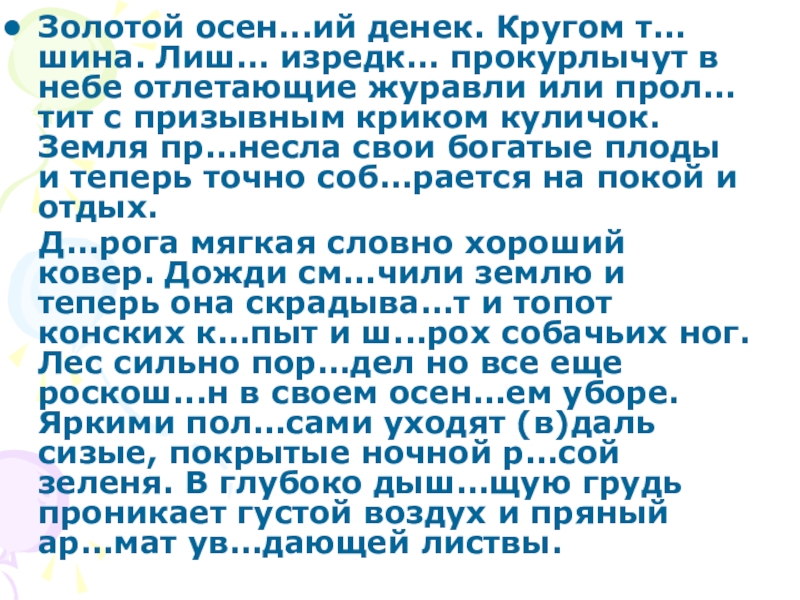 Золотой осен...ий денек. Кругом т...шина. Лиш... изредк... прокурлычут в небе отлетающие журавли или прол...тит с призывным криком куличок. Земля пр...несла свои богатые плоды и теперь точно соб...рается на покой и отдых. Д...рога мягкая словно хороший