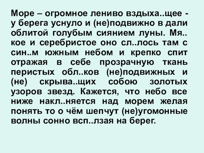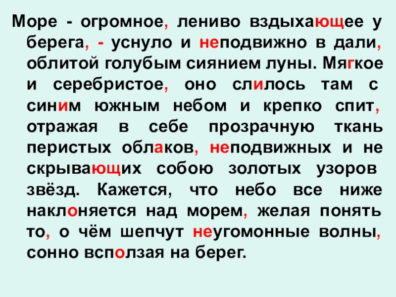 Слайд 17Море – огромное лениво вздыха..щее - у берега уснуло и (не)подвижно