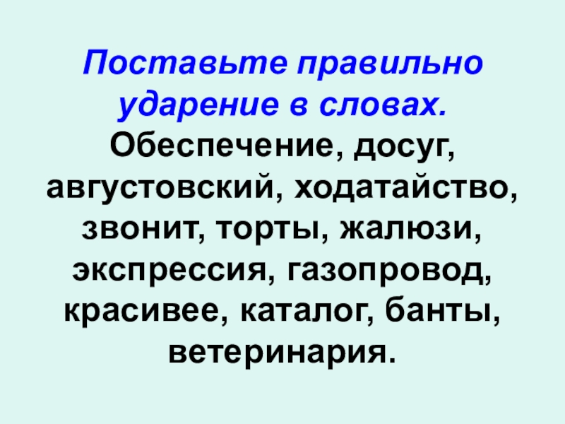 Слайд 3Поставьте правильно ударение в словах. Обеспечение, досуг, августовский, ходатайство, звонит, торты,