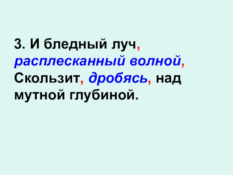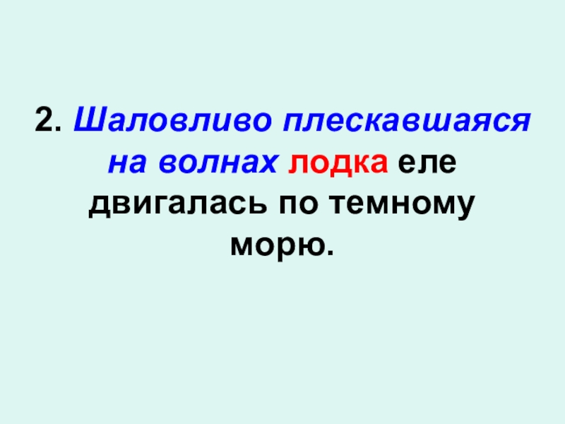Слайд 212. Шаловливо плескавшаяся на волнах лодка еле двигалась по темному морю.